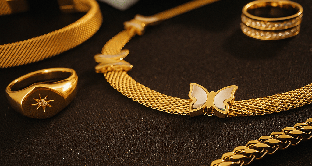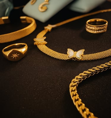 Descubre nuestra colección de joyas en stainless steel con tres baños de Oro 18K, alta calidad, hipoalergénicas y resistente a la playa.